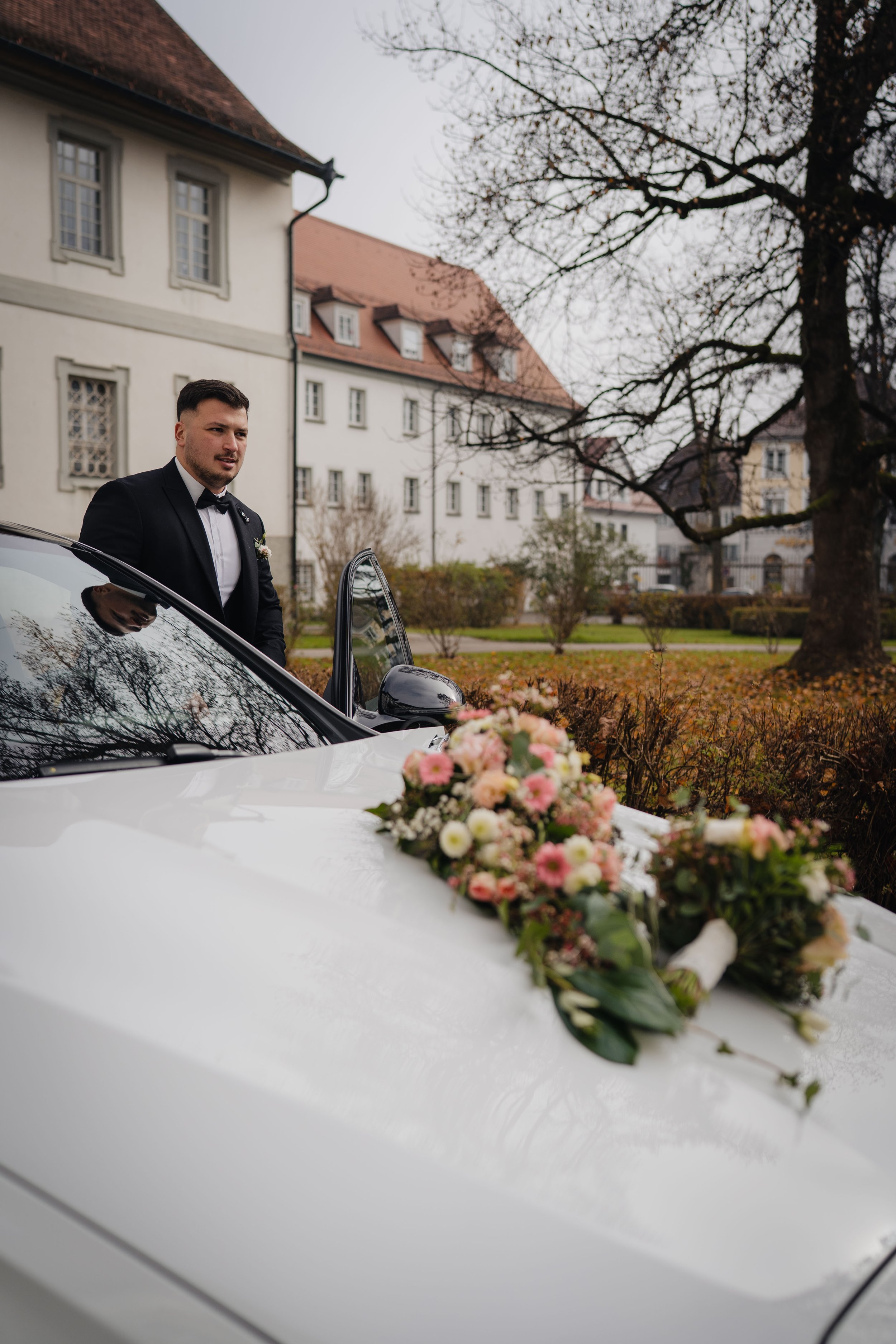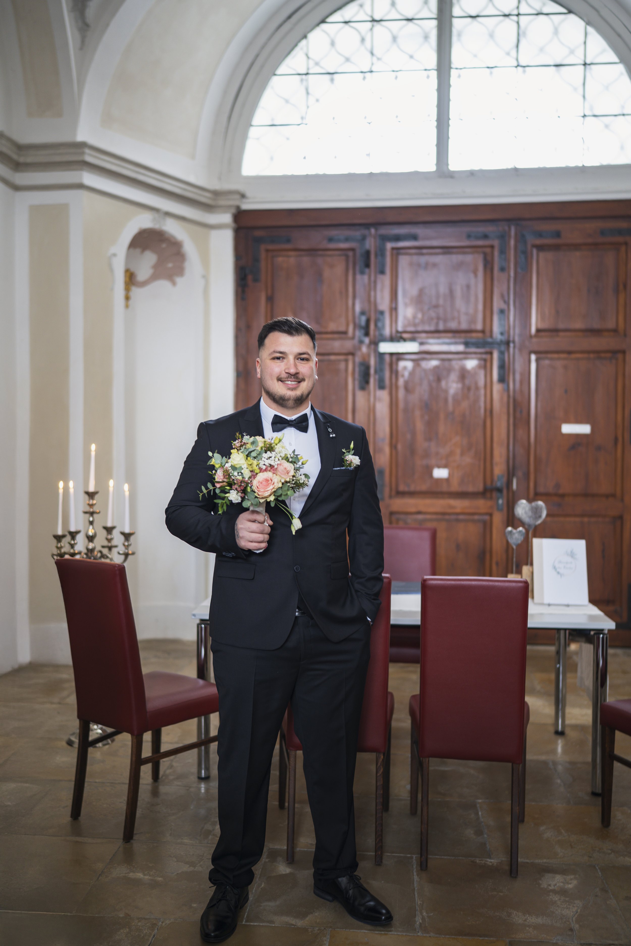 Ein frisch vermähltes Paar vor einem historischen Gebäude, der Bräutigam in einem blauen Anzug und die Braut in einem weißen Hochzeitskleid mit Schleier, die Braut hält einen Blumenstrauß aus hellen Rosen.