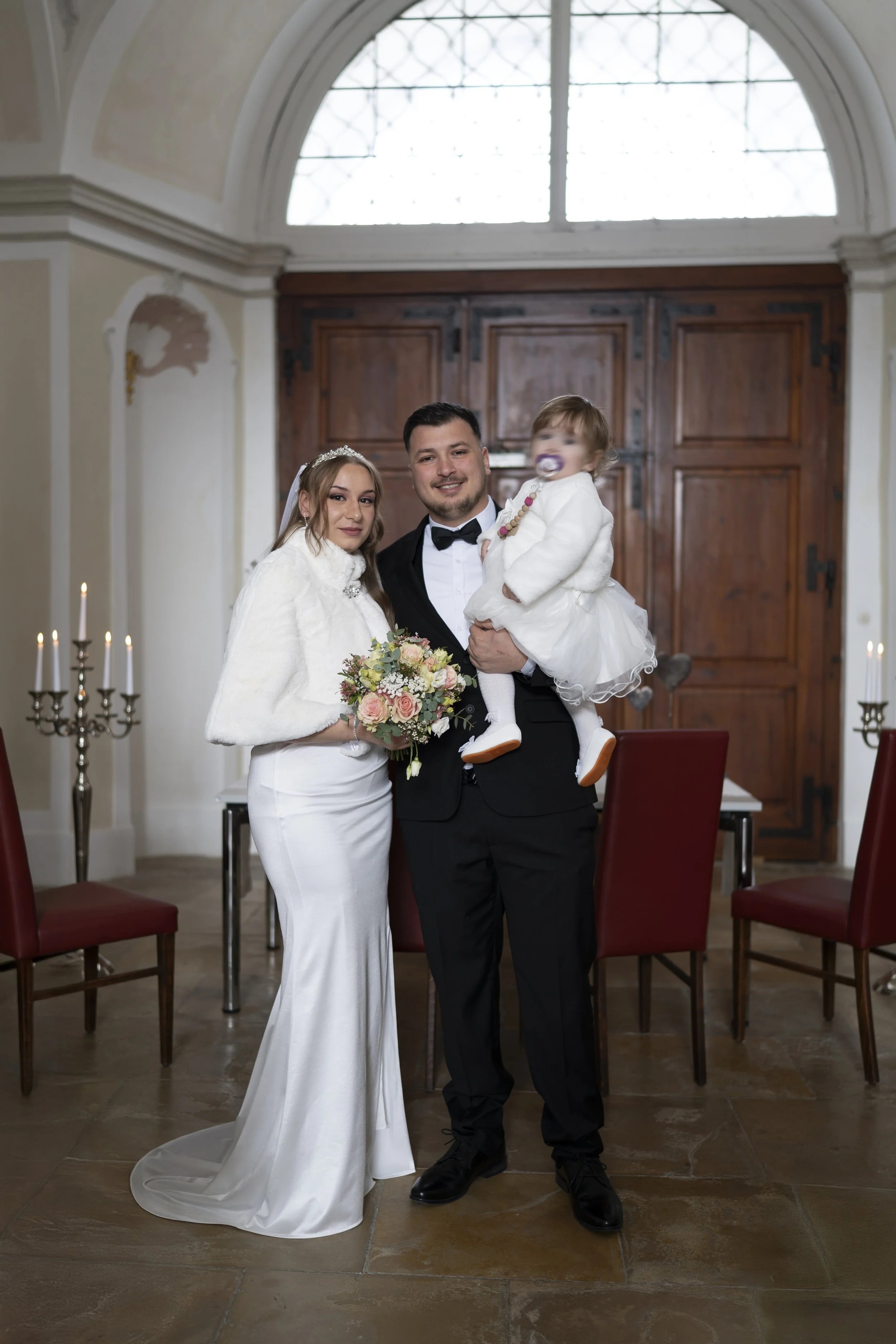 Familie bei einer Hochzeit: Mutter hält ihre Tochter, während der Bräutigam lächelnd zu ihnen schaut, alle in einem Raum vor großen Fenstern.