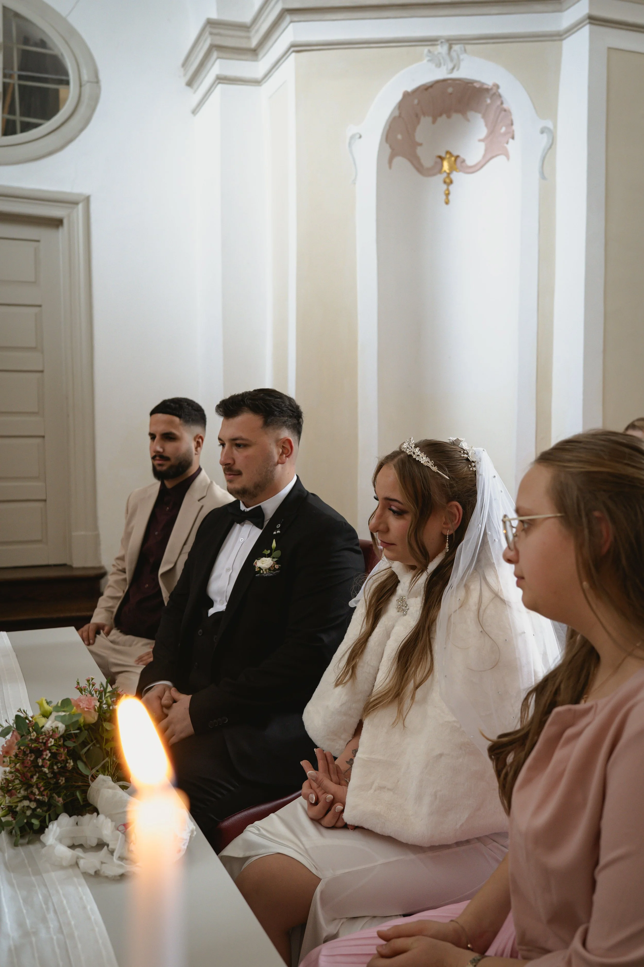 Hochzeitspaar mit zwei Gästen in einer goldverzierten, historischen Halle bei der Trauung.