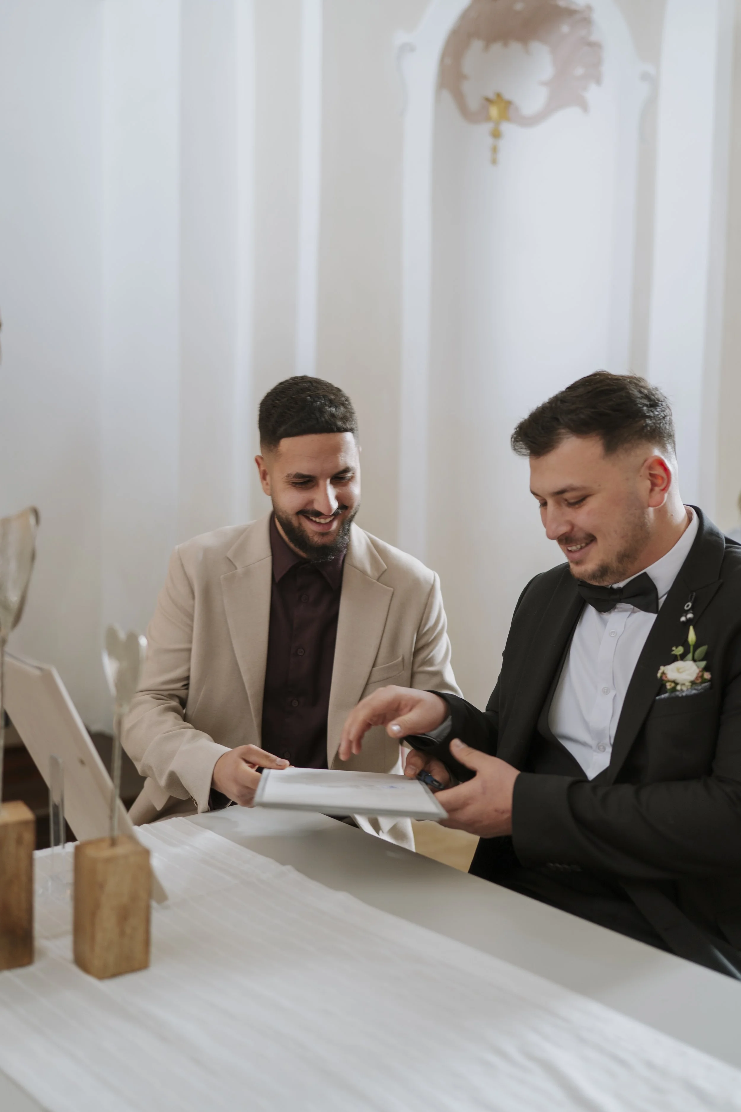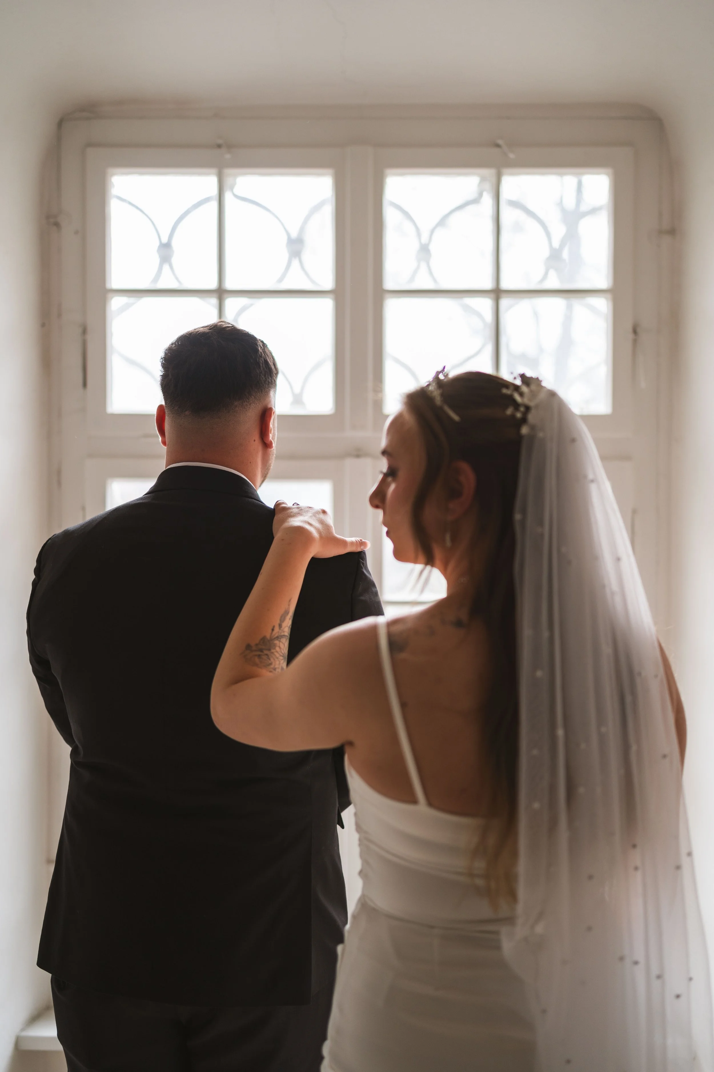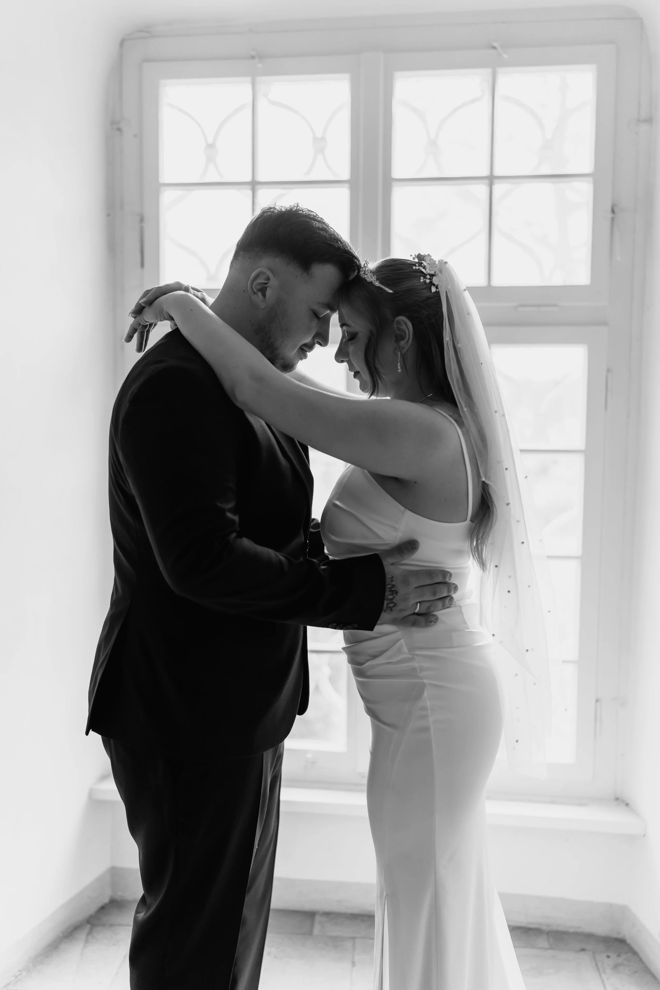 Ein Brautpaar steht vor einem großen Fenster, die Braut trägt ein weißes Hochzeitskleid mit Schleier, der Bräutigam trägt einen schwarzen Anzug. Die Braut hält einen Blumenstrauß, beide schauen sich liebevoll an.