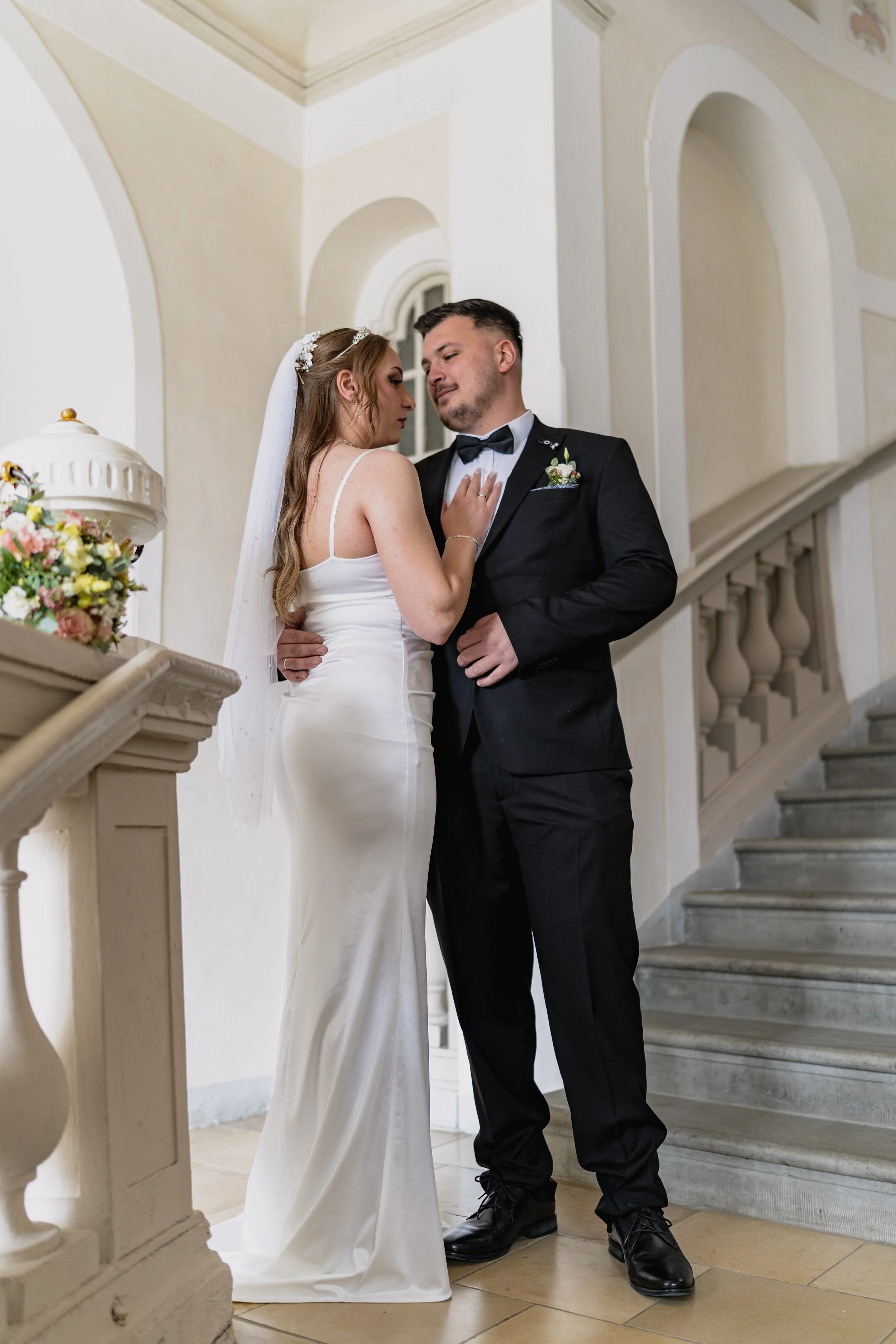 Ein Brautpaar steht auf einer Treppe vor einem Gebäude, der Mann trägt einen hellen Anzug, die Frau ein langes weißes Kleid, sie hält einen Brautstrauß und sie schauen in die Kamera.