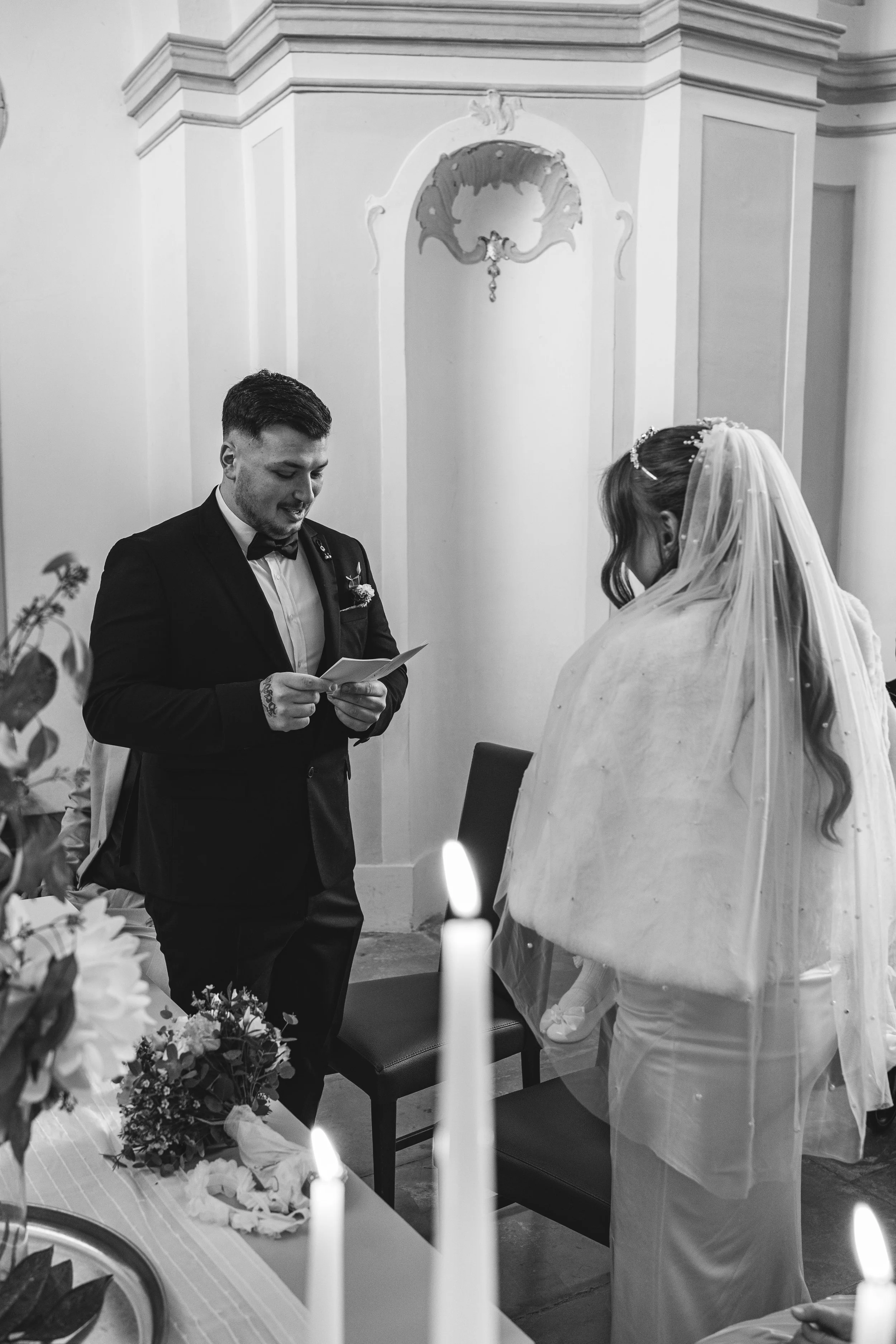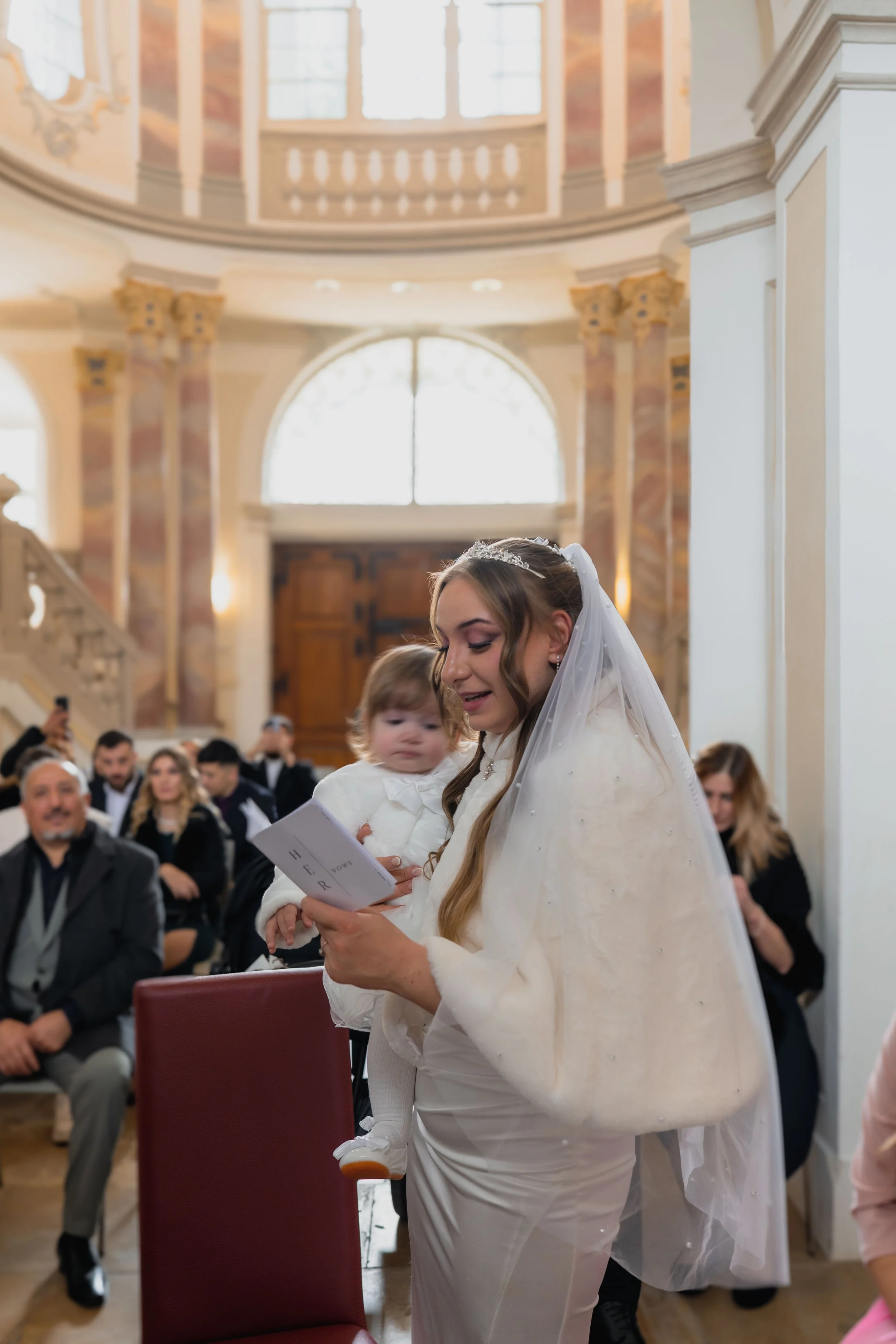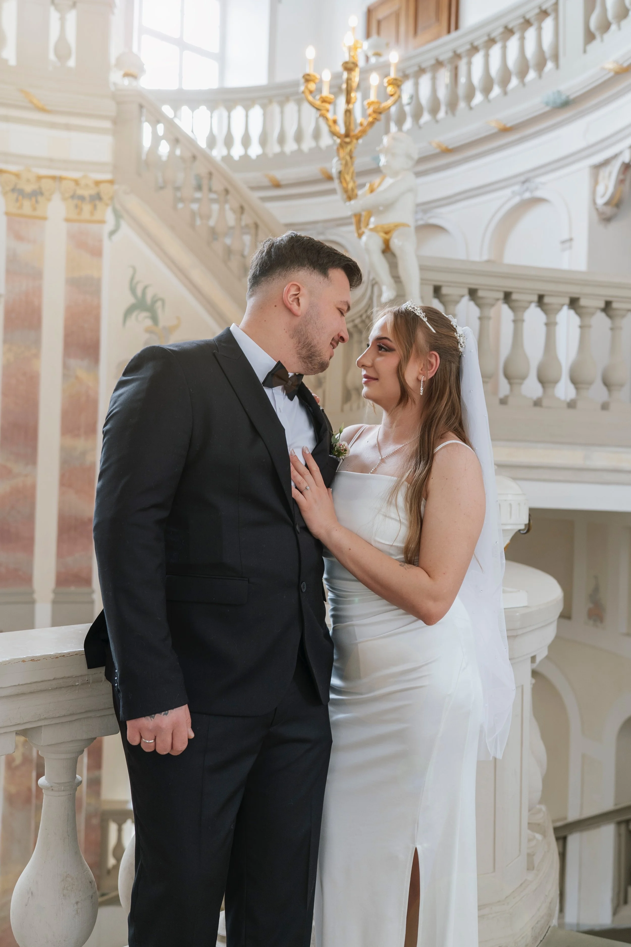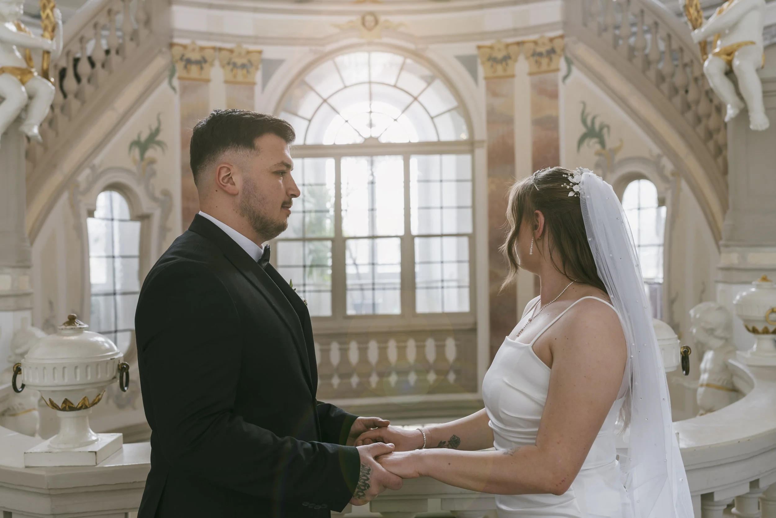 Ein Brautpaar steht sich in einem prunkvollen, barockartigen Saal gegenüber und umarmt sich während ihrer Hochzeit. Die Braut trägt ein weißes Hochzeitskleid mit Schleier und der Bräutigam einen dunklen Anzug. Im Hintergrund sind kunstvolle Dekoratio