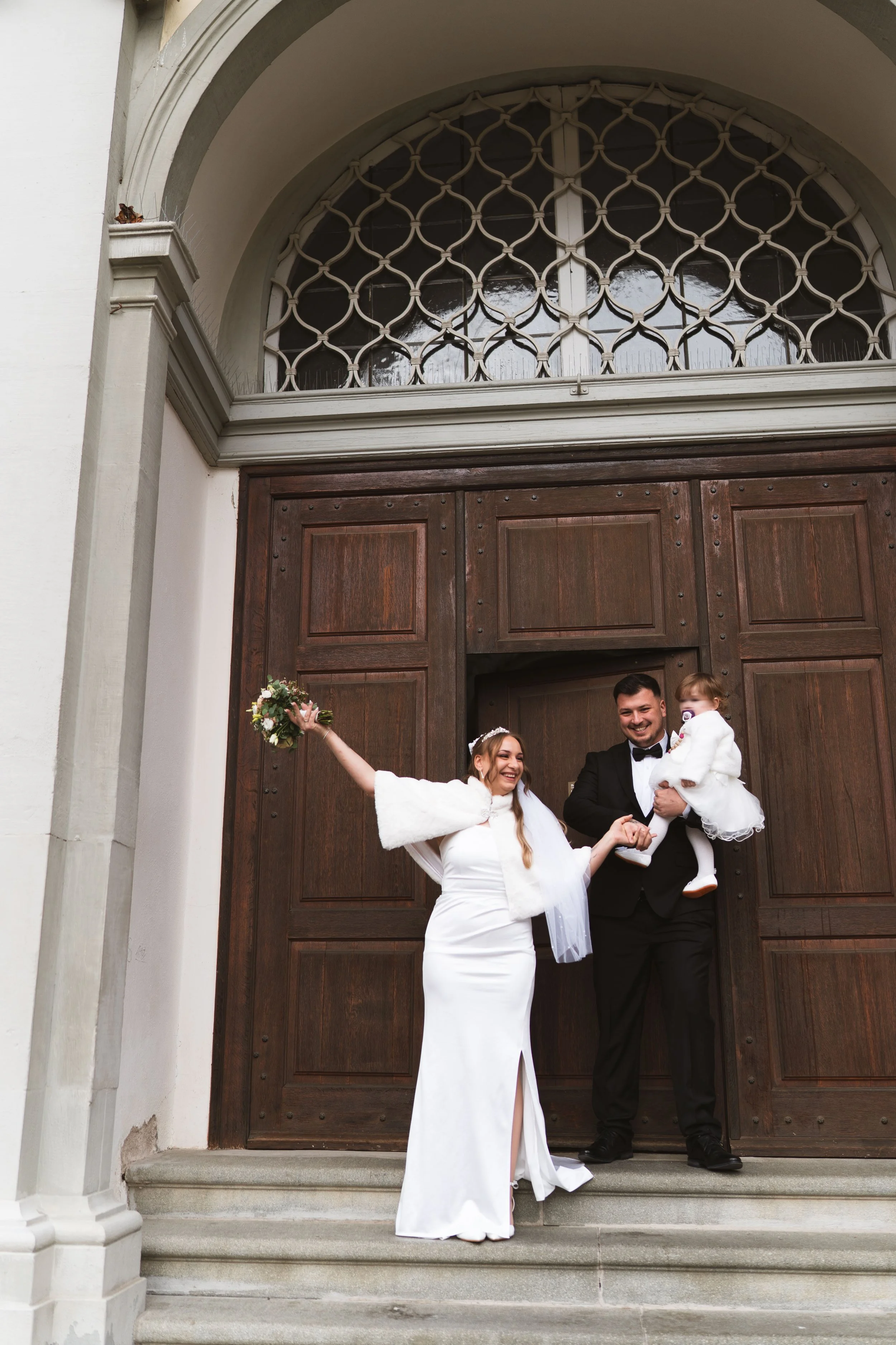 Ein Brautpaar mit einem Baby, das bei einer Hochzeit im Haus gehalten wird, lachend und in einem Raum mit großen Fenstern im Hintergrund.