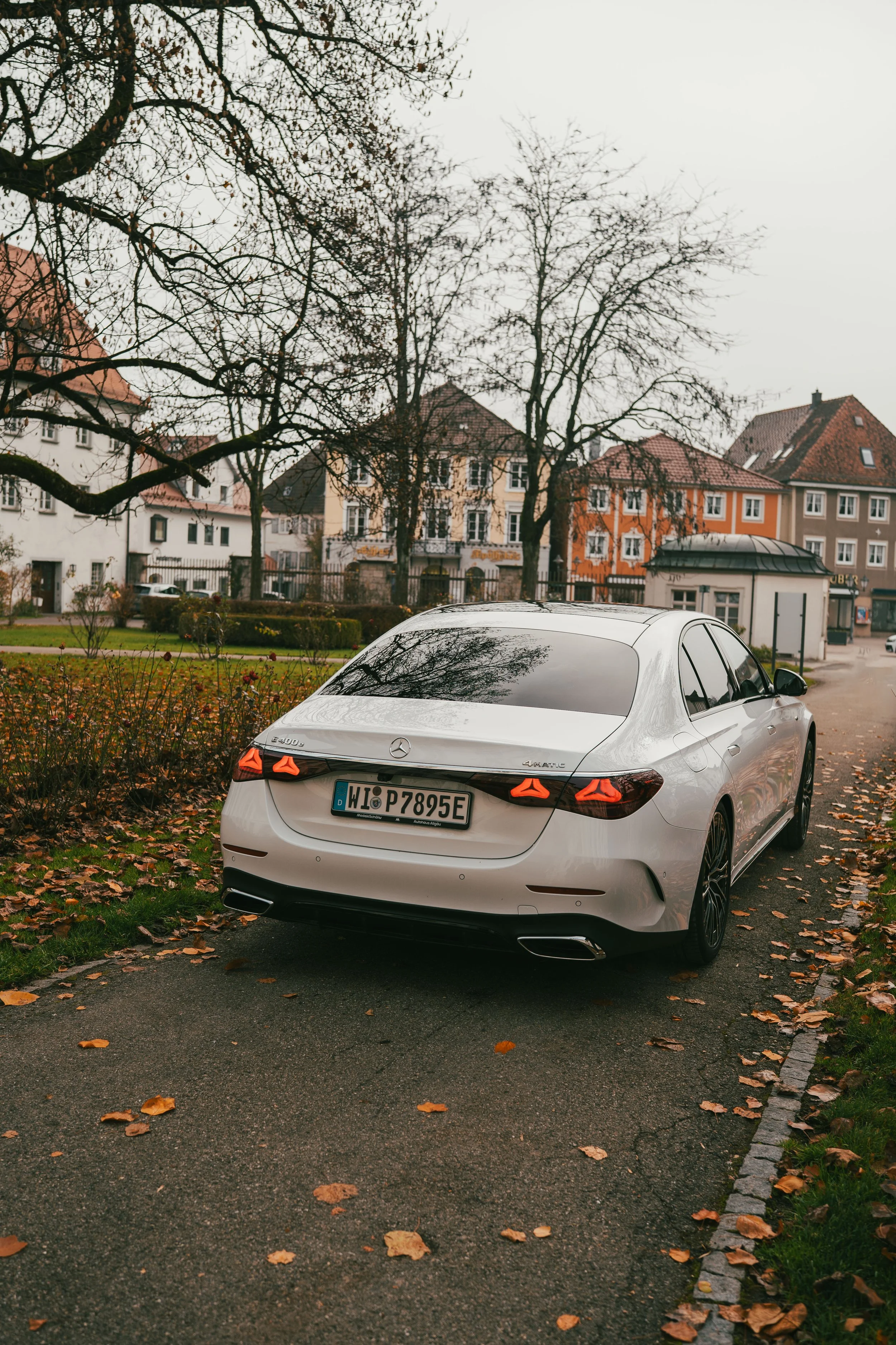 Eine belebte Straße in einer europäischen Stadt mit Autos, Fußgängern und festlichen Weihnachtsdekorationen wie Lichtgirlanden und schwarzen Weihnachtskugeln, die über der Straße hängen.