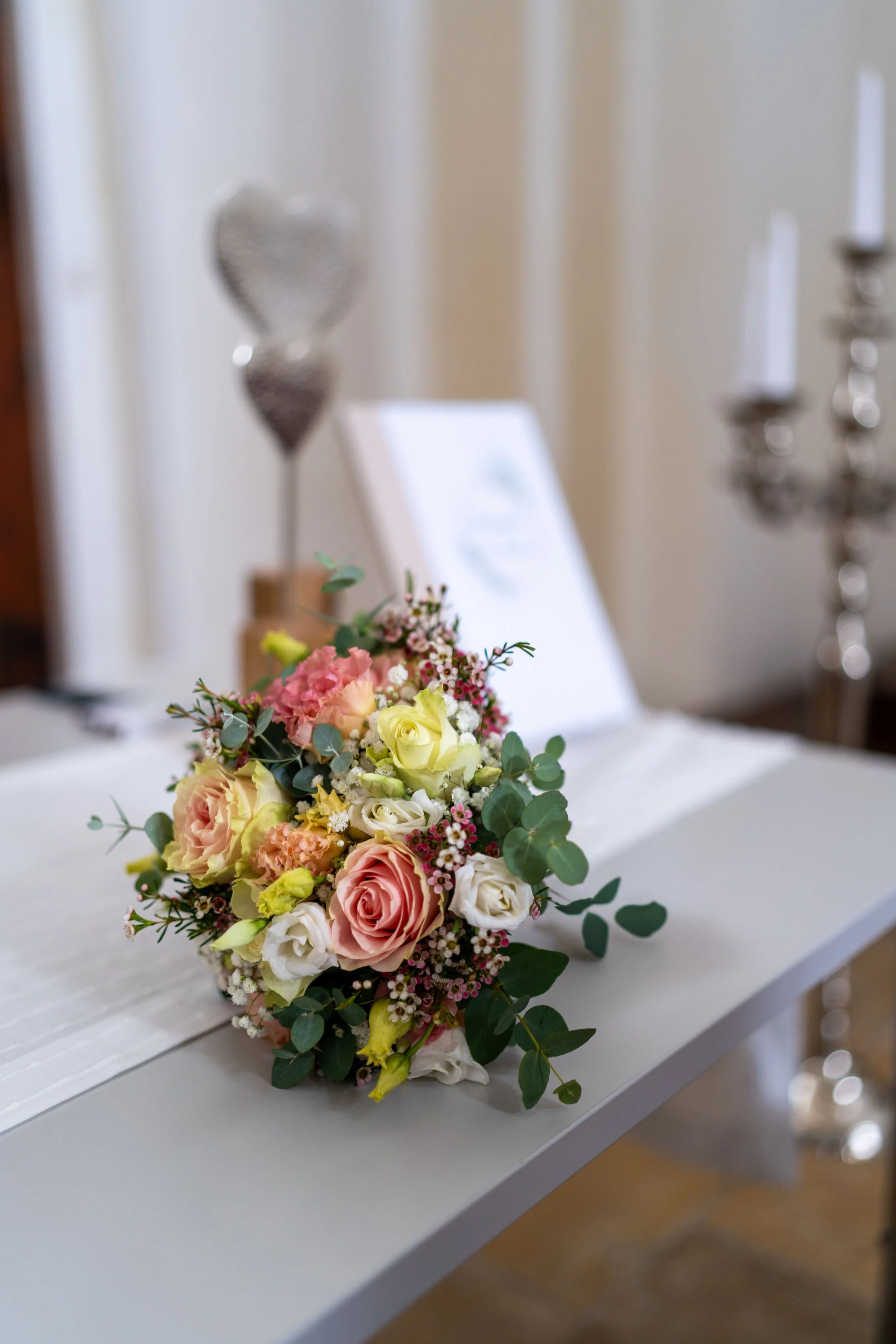 Braut im weißen Hochzeitskleid hält einen Blumenstrauß und bekommt ihn vom Bräutigam im Anzug in einem eleganten, barocken Raum mit Goldverzierungen, Bücherregalen und einer Skulptur.