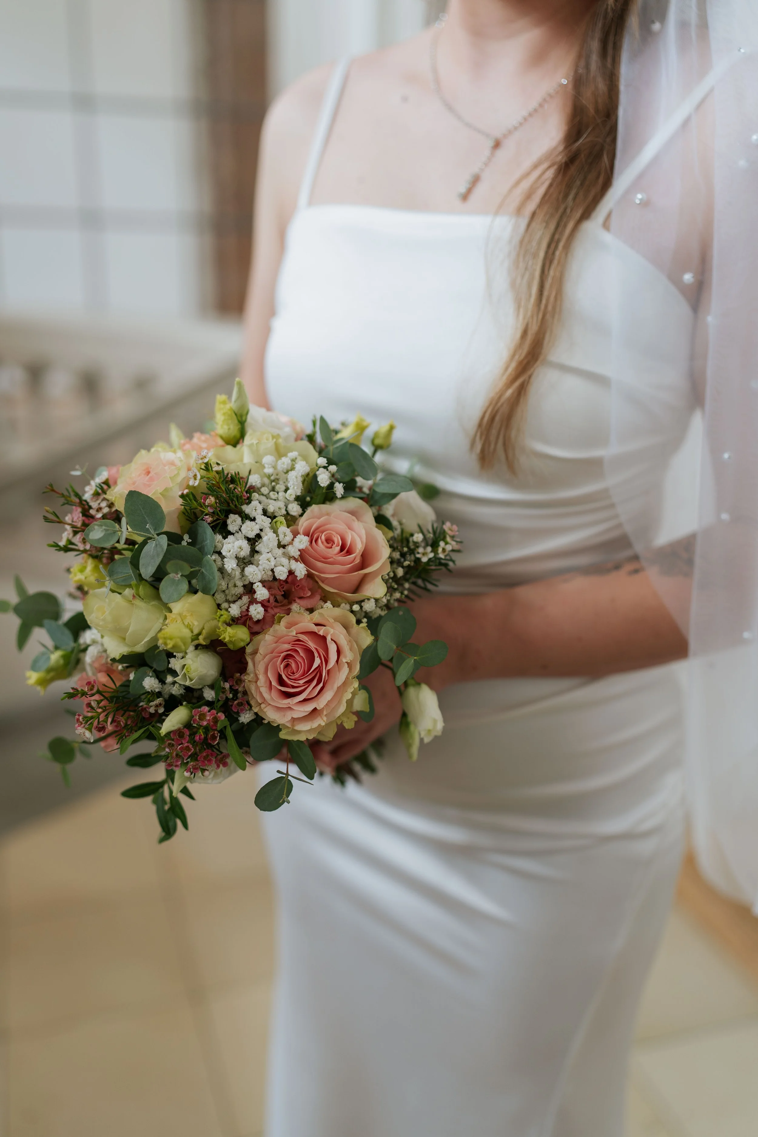 Braut mit Schleier und Brautkleid hält einen Blumenstrauß vor einem Fenster, das Tageslicht hereinlässt.