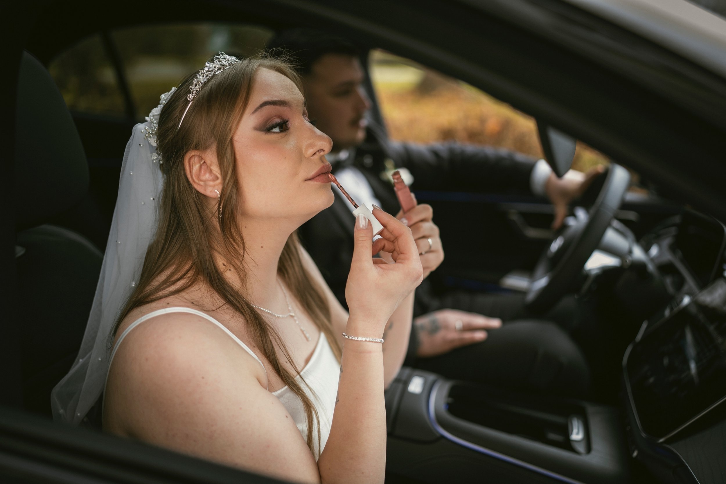 Frau mit dunklen Locken benutzt Lippenstift in einem Auto.